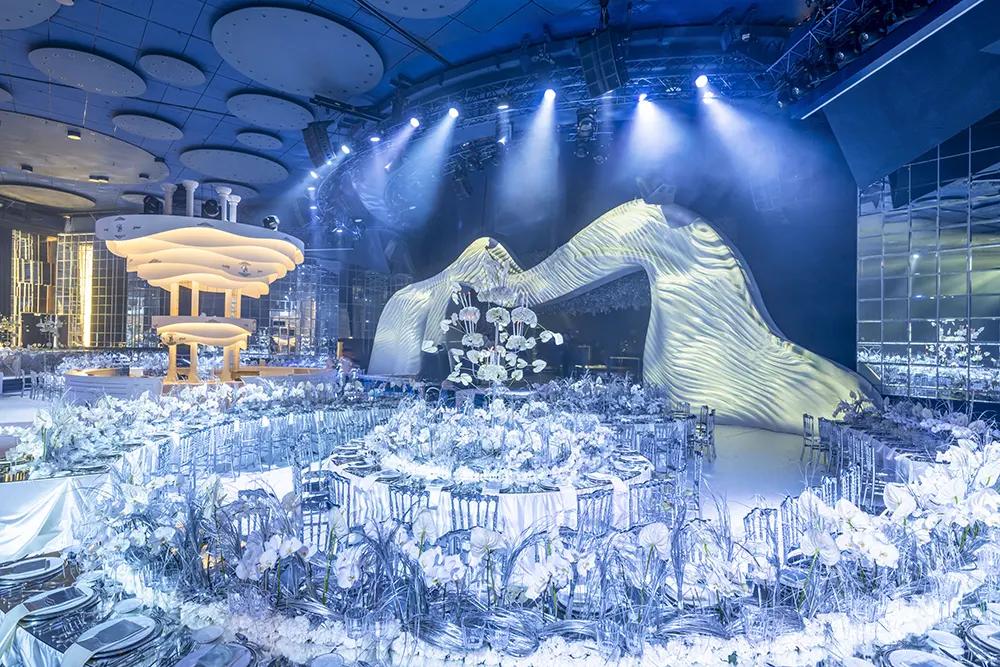 Ce projet, conçu pour le mariage H&G, illustre parfaitement notre expertise en scénographie, décoration de mariage, création de décors sur-mesure et aménagement d’espaces prestigieux.